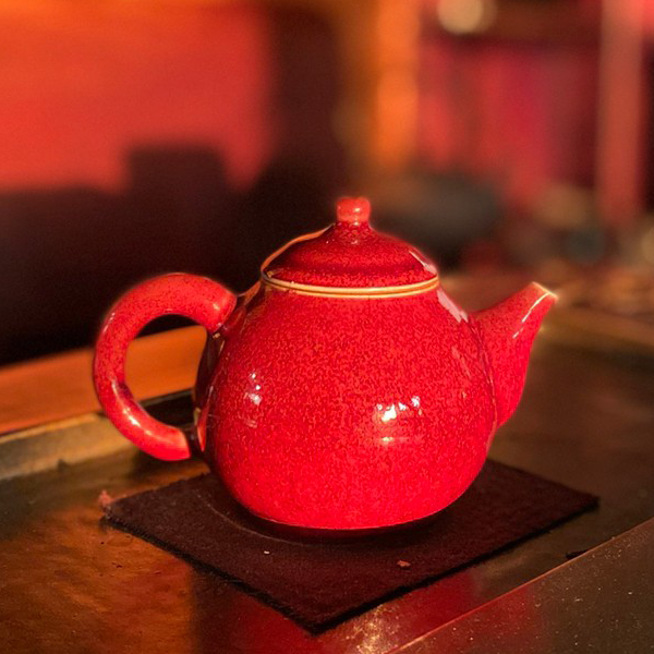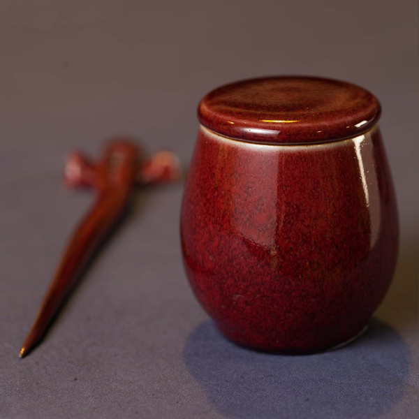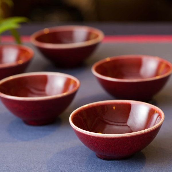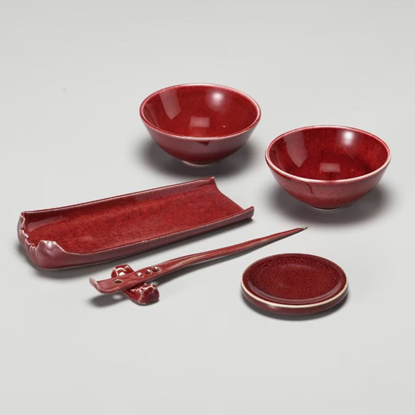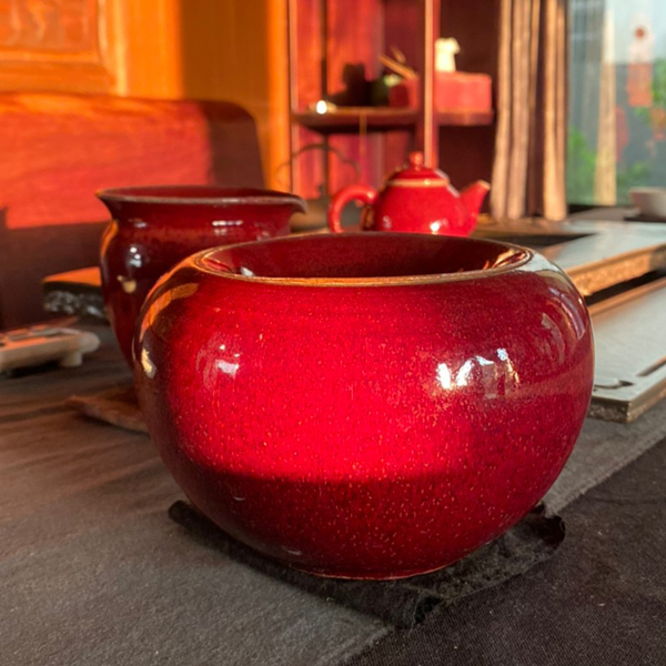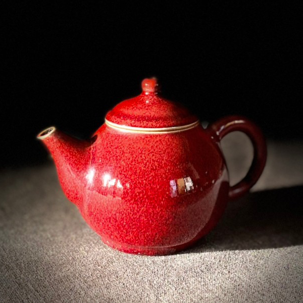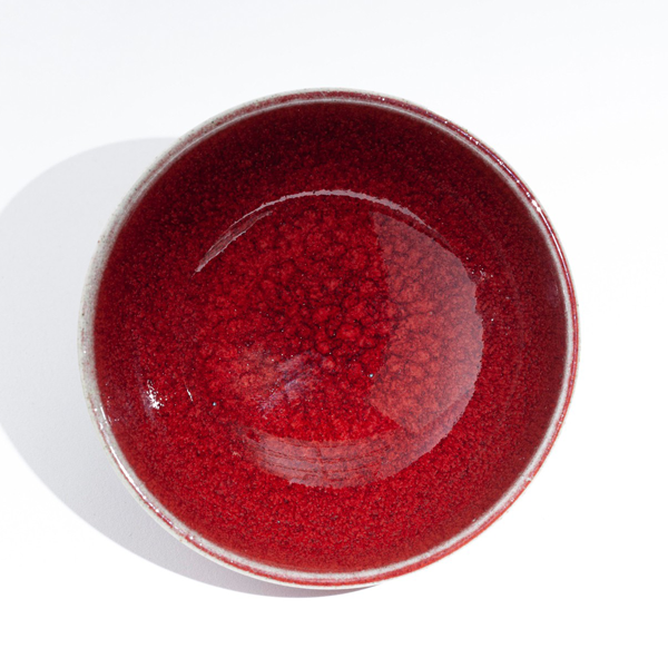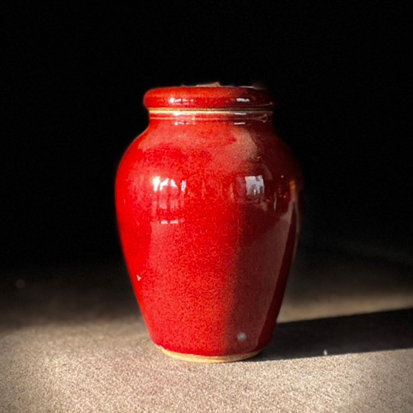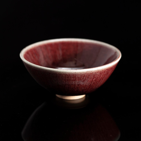 明如鏡潤如玉赤如血由於銅在高溫選原氣氛中容易揮發,想要留住飽滿而美艷的郎紅作品極其困雞,失敗率遠高於其他釉色。故民證有「若要窮,燒郎紅」的說法